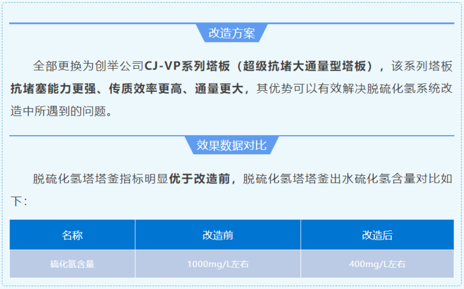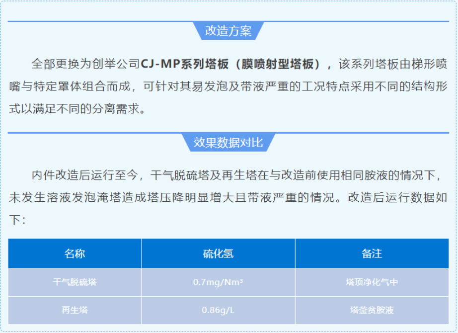 全部工程改造完工后,各項技術(shù)指標均滿足生產(chǎn)要求,達到了改造的目的和預(yù)期,緩解業(yè)主單位的環(huán)保壓力的同時延長了設(shè)備檢修周期。創(chuàng)舉公司新型CJ系列高效噴射態(tài)塔盤技術(shù)在脫硫化氫塔、干氣脫硫塔及再生塔的應(yīng)用效果,得到了榆林煉化領(lǐng)導(dǎo)的高度認可。該項目的順利開車是創(chuàng)舉公司在行業(yè)內(nèi)的又一次成功改造案例。