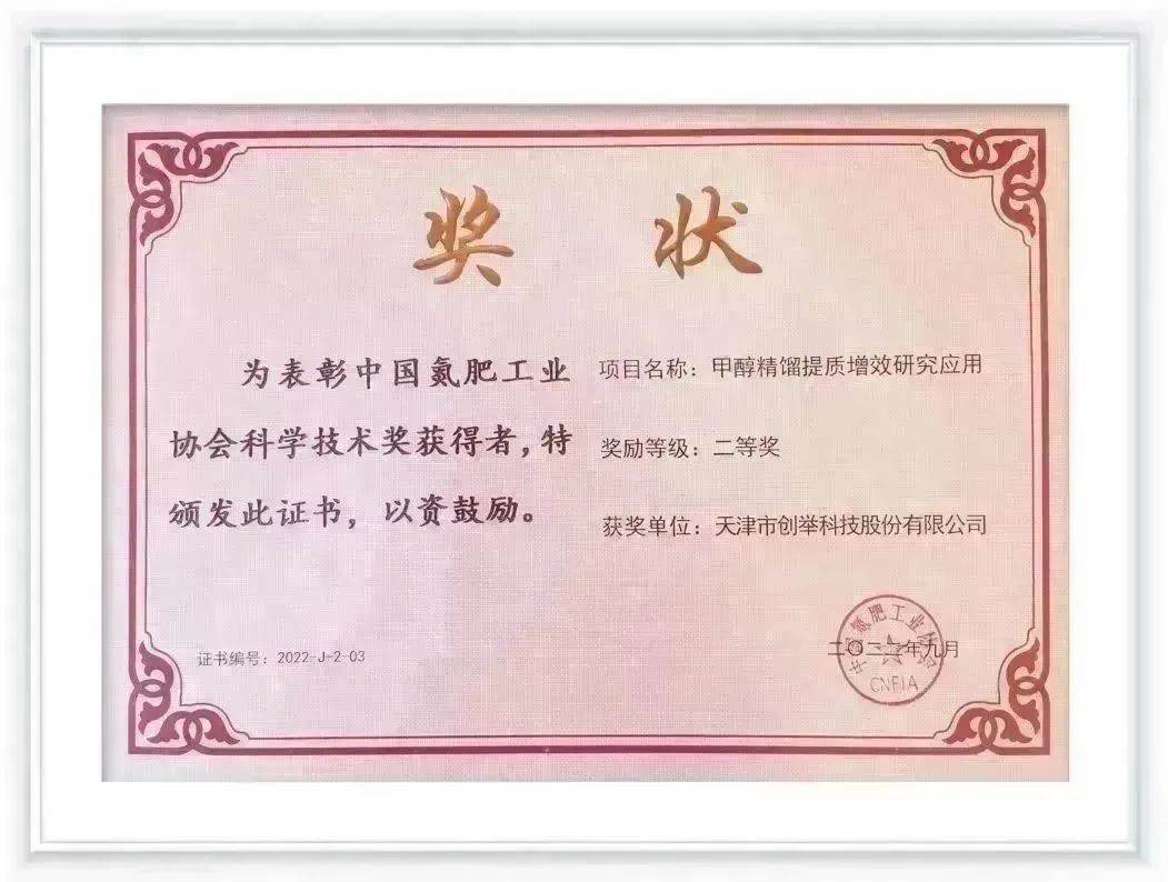 會上,中國氮肥工業協會對科技創新方面做出突出貢獻的企業進行了表彰。天津市創舉科技股份有限公司(以下簡稱“創舉科技”)申報的“甲醇精餾提質增效研究應用”項目,榮獲中國氮肥工業協會科學技術獎二等獎。
